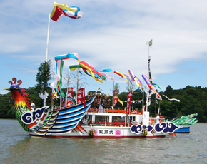 さて、祭りの中心となる神輿ですが、鹽竈神社のほうが総黒漆塗りで通称黒神輿、志波彦神社のほうが昭和三十八年に水産業界から奉納された一部朱塗りで通称赤神輿と呼ばれており、「御座船龍鳳丸」に奉安され海上渡御されます。二隻の御座船が共船を従え海上渡御する様は華麗・荘厳で安岐の宮島の管弦祭・神奈川県貴船神社の貴船祭と共に三大船祭に数えられ、国際的にも知られております。現在は塩竈市を中心とした「みなと祭協賛会」が組織され、前夜祭の花火大会や当日のパレードや「よしこ」のコンテスト等市を挙げての盛大な祭となっております。