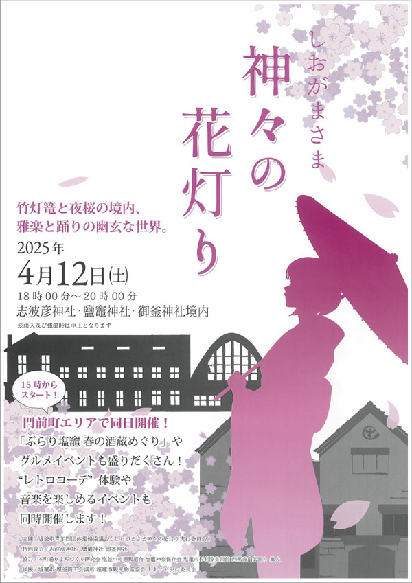 神々の花灯り 2025年4月12日(土) 18時00分~20時00分 志波彦神社・鹽竈神社・御釜神社境内 ※雨天及び強風時は中止となります。 チラシダウンロード(PDF:1.09MB) お問い合せ先:塩釜市青年四団体連絡協議会 TEL:022-367-5111